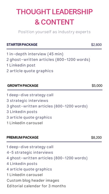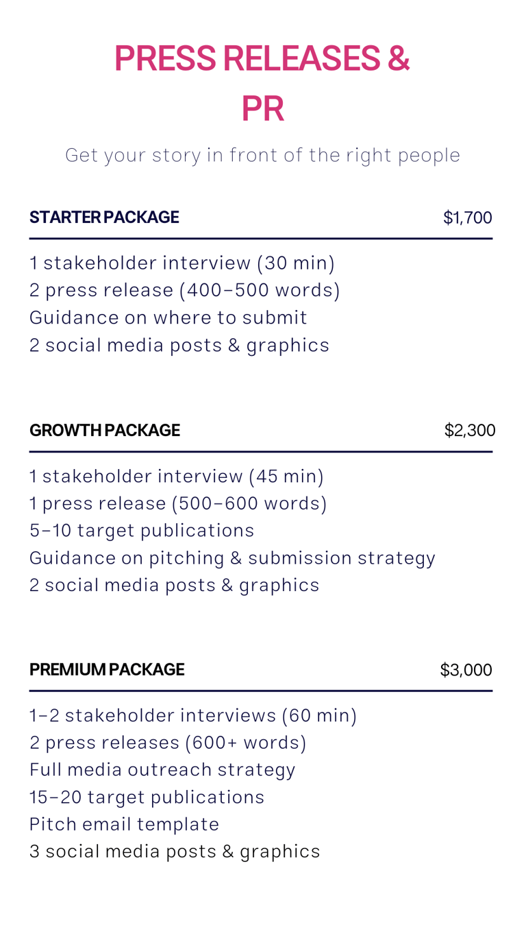 Your business is unique, and so are your goals. Our packages are designed to deliver impactful results while meeting you where you are. Let’s bring your vision to life with a package that fits your needs.